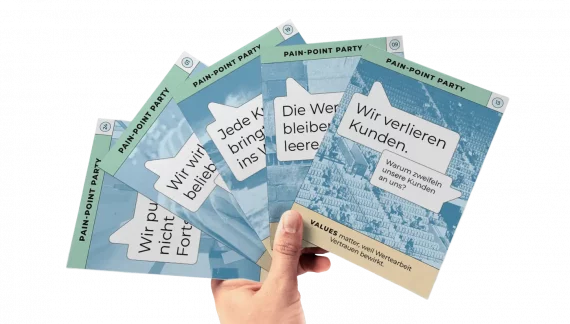 Produkt Spiel Papier & Online Gefördert durch: Pain-Point PartyZusätzliche Anleitung und Tipps Ihr habt das Spiel PAIN-POINT PARTY erworben? Dann findet Ihr hier auf dieser Seite wichtige Hinweise darüber, wie man das Spiel spielen kann und sollte – und wie die einzelnen Karten und insbesondere die Fragen zu interpretieren sind. Ziel ist grundsätzlich, aus einer rein „verkopften“ Denke auszusteigen und eher intuitiv spielerisch zu agieren. FAQ 1. Was ist die Pain-Point Party eigentlich? Stell dir vor, euer Team sitzt an einem Tisch … und plötzlich werden Herausforderungen zu Chancen und Perspektiven zu Spielkarten!Die Pain-Point Party ist kein klassisches Meeting, sondern ein kreatives Abenteuer, das euch hilft, festgefahrene Muster aufzubrechen, verborgene Chancen zu entdecken und gemeinsam frische Ideen zu entwickeln. 2. Wer ist der Pain-Point Pilot – und warum braucht es ihn? Der Pain-Point Pilot ist so etwas wie der Spielleiter – aber mit einer besonderen Mission:Er sorgt dafür, dass ihr […]